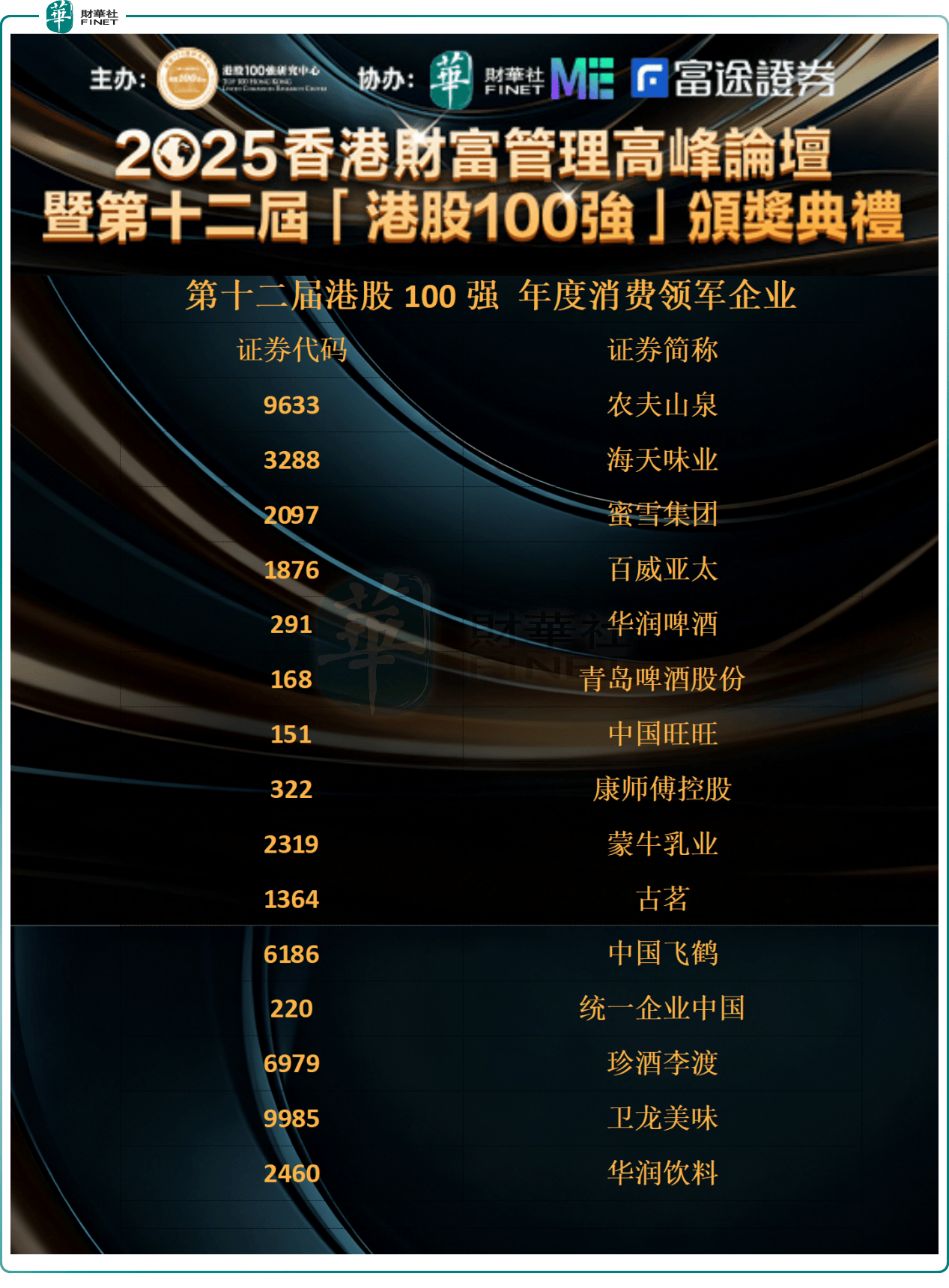 表此,K)、青岛啤酒(00168.HK)三大啤酒巨头联袂入围百威亚太(01876.HK)、华润啤酒(00291.H,HK)、中国飞鹤(06186.HK)等国民品牌纷纷上榜中国旺旺(00151.HK)、蒙牛乳业(02319.,0220.HK)、康师傅控股(00322.HK)、华润饮料(02460.HK)亦依靠不同化上风告成登榜古茗(01364.HK)、珍酒李渡(06979.HK)、卫龙鲜味(09985.HK)、同一企业中国(0。