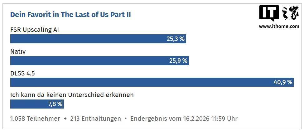 结尾生还者 Part II》中FSR 呈现最靠近的一次是正在《4六款游戏盲测:英伟达DLSS,.3% 的选票取得了 25,染的 25.9%但仍略低于原生渲。